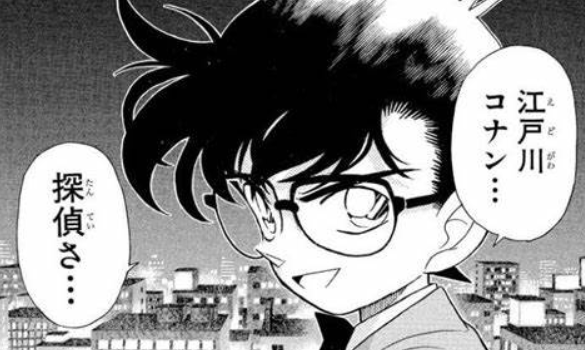 Instead of Conan saying his usual phrase “There is only one truth” 真実はいつも一つ (Shinjitu wa itsumo hitotsu), he says 真実はいつもタツタ(Shinjitu wa itsumo tatsuta) or “The truth is always Tatsuta” (or maybe “There is only one Tatsuta”. It’s a nice play on words.