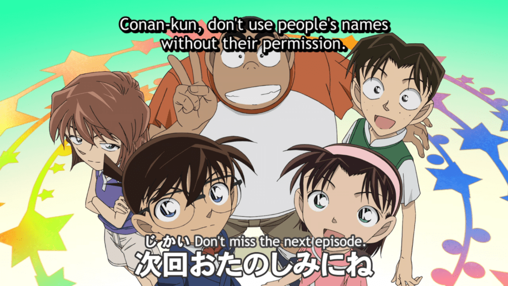 During the end credit scene, I found it funny that Conan is calling out Kogoro for impersonating someone. And to end the episode Ran gives him a little advice.