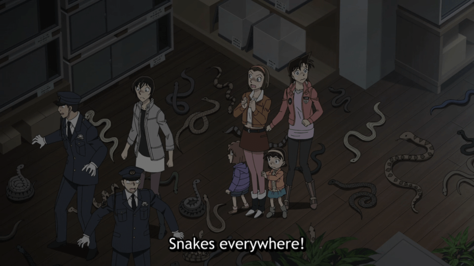 Plus, how the heck did they not see or hear the snakes on the floor (especially Haibara and Ayumi). Luckily The Snake Three are there to save the day.